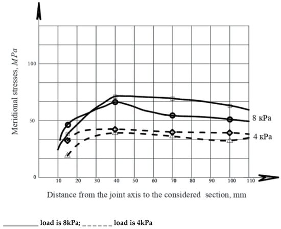 The meridional stress diagrams, constructed on the basis of experimental data, in accordance with Figure 8, show that the bend of the field joint does not significantly affect the meridional stress distribution in the joint zone.