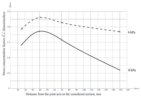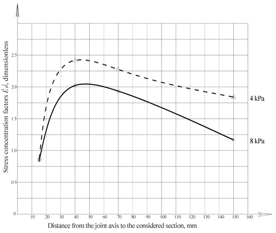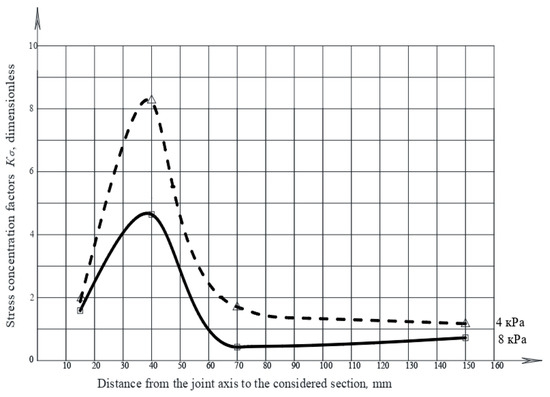 According to the experimental data, the hoop and meridional stress concentrations in the joint zone were estimated, in accordance with Figure 8, Figure 9, Figure 10 and Figure 11, depending on the bend value and internal pressure in the model.