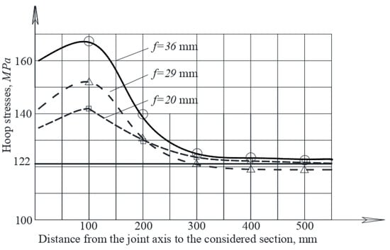 Distribution of the hoop stresses in the joint zone with the wall bend in the joint point f equal to 30 mm and 50 mm.