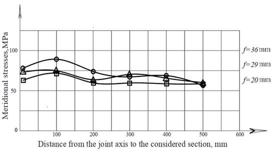 The maximum meridional stresses were as follows: at the bend of 36 mm—83 MPa, 29 mm—75 MPa and 20 mm—72 MPa.