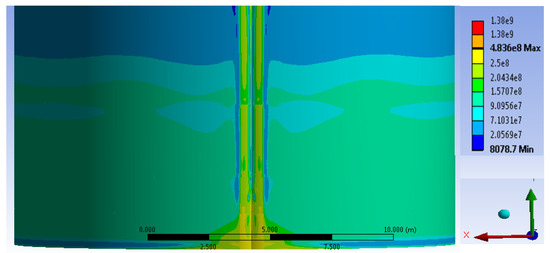 Distribution of equivalent stresses in the field joint zone with the joint imperfection at a = 50 cm; f = 10 cm.