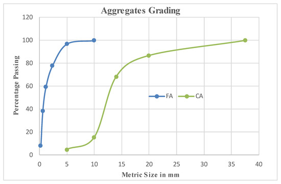 Coir fiber (CF) was obtained from the Sukkur region, Sindh, Pakistan, where it was readily available and was used as a volume fraction in concrete. Coir fiber is accessible in several lengths, fluctuating from 10 to 30 mm and 0.2 mm in diameter. In this research work, Portland cement (PC) was used as a binding component. The PC was purchased in a local market in Hyderabad, Pakistan. Table 1 shows the oxides composition of PC, and Table 2 displays the chemical properties of CF. Moreover, Table 3 indicates the physical properties of the aggregates. The fine aggregates (FA) were river sand that passed through a #4 sieve, while the coarse aggregates (CA) were crushed stones with a size of 20 mm. The bulk density and sieve analysis of aggregates was estimated using ASTM C29/C29M-97 [30] and ASTM C136/C136M-19 [31] consistently. The grading curves for CA and FA are demonstrated in Figure 1. Furthermore, ASTM C128-01 [32] and ASTM C127-15 [33] were applied to determine the specific gravity and water absorption of FA and CA congruently. In addition, for the research investigation, tap water was utilized to help in the mixing and curing processes.