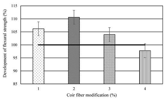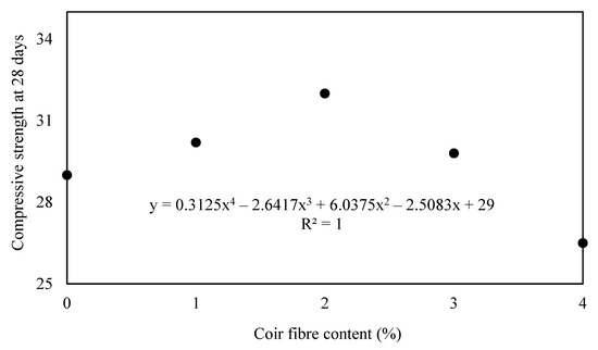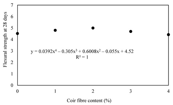 Flexural strength is also a measure of the capacity of splitting tensile strength in concrete. It is obvious that the results are identical to the tensile strength test results in improving flexural strength up to 2%. The addition of fiber results in an increase in strength [44], whilst the sudden decrease in strength can be due to the formation of a weaker inter-transition zone around fibers and the physical properties of coir fibers, such as length, diameter, and thickness. Moreover, the pollution available on the outer surface of the fiber stack can also result in the retardation of strength, as mentioned by Ranjitham et al. [51]. However, Figure 9 gives a fourth-degree relationship between the content of coir fiber and the flexural strength of the coir fiber-modified concrete, tested at 28 days.