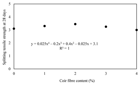 A fourth-degree relationship between the content of coir fiber and the splitting tensile strength of the coir fiber-modified concrete.