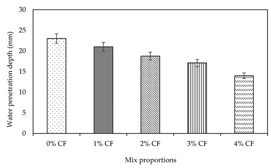 The results of the permeability of concrete along with 1%, 2%, 3%, and 4% coir fibers are presented in Figure 11, while Table 10 presents the descriptive statistical analysis of the permeability results. This test measures the connectivity of pores inside the concrete, and it is strongly related to the MOE, hardness, and mechanical strengths mentioned above. The permeability of coir fiber-reinforced concrete was tested in terms of water penetration depth of concrete specimens subjected to water under pressure. The specimens were split, and afterward, the water penetration depth was noted in line with the guidelines of the BS EN 12390-8 standard [41] to assess the permeability of the concrete. From the results, it can be noticed that the permeability of coir fiber-reinforced concrete was recorded as 21, 18.75, 17.10, and 14 mm at 1%, 2%, 3%, and 4% coir fiber-reinforcement content, respectively. The inclusion of coir fibers in concrete increases the stiffness of concrete, which prevents the penetration of moisture, consequently enabling the specimens to withstand the cracking forces.