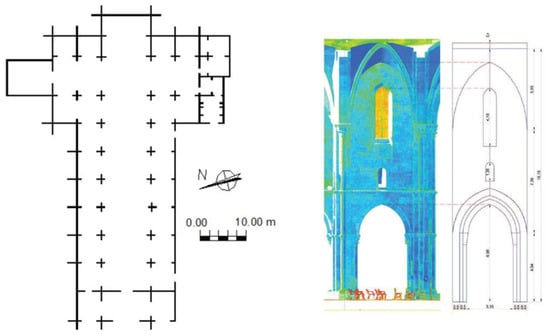 Regularized plan layout of the church (on the left) and drawing geometry from the point cloud (on the right).
