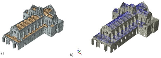 Three-dimensional model of the church: (a) geometrical model and (b) finite element model.