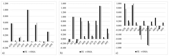 Comparison between FEM and Operational Modal Analysis (OMA): (a) Mode shape 1, (b) Mode shape 2 and (c) Mode shape 3.