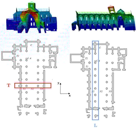 Two 2D macro-elements were selected by analysing the portion of the building involved in the first and the second modal shapes. In Figure 9, the plan layout of the church with the selected macro-elements is represented: the macro-element T and the macro-element L. In the upper part of the same Figure 9, a section of the the first and the second modal shapes in correspondence of the selected macro-elements, is also reported.