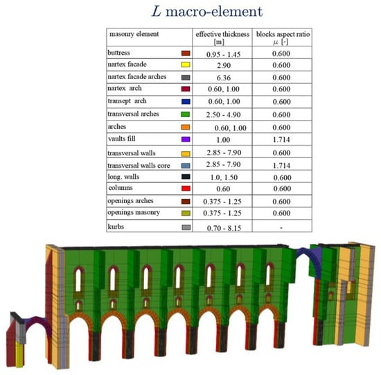 The two-dimensional section shown in Figure 11, L macro-element, consists of a portion of wall about 72 m long and 18.6 m high. The large arch of about 7.0 m in width and 17.0 m in height represents a section of the vault at the transept. At the left of the transept, a sequence of eight arches is visible in the lower part and a sequence of seven openings in the upper part. At the right of the transept, the wall is massive with small openings (Figure 11). The section was discretised by mean of 49,259 triangular elements.