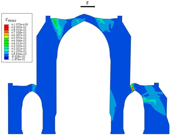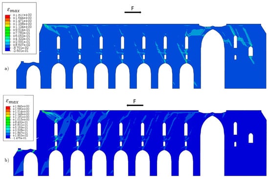 Figure 14 shows the distribution of the maximum plastic strains in the case of the section pushed in the positive (a) and negative (b) direction. Concerning the positive loading direction, the part of the section mainly involved in the failure is the one adjacent to the transept where a strong concentration of plastic strains is observed. The same result is found in other similar case studies []. Further, diagonal failure patterns are observed above almost all the openings.