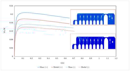 In Figure 15, the capacity curves for the two different loading directions are shown. In the same Figure 15, the curves obtained pushing the macro-element with horizontal forces proportional to the masses are also represented, for both the directions, positive and negative. As for the previous section, the horizontal loading consistent with the modal shape results in a lower capacity of the structure.