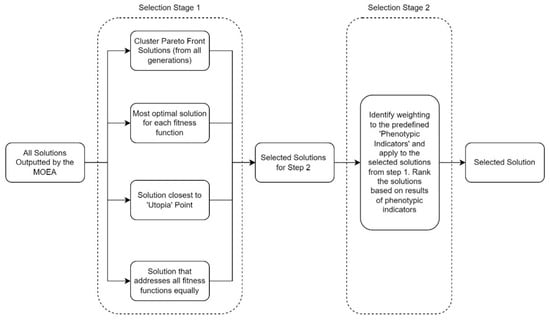 Posteriori selection strategies are primarily driven by quantitative methods of analysis, mainly due to the volume of data generated by the algorithm and the associated population size needed for the algorithm to successfully converge towards optima solutions. Conversely, qualitative selection strategies (if not translated numerically) necessitate a solution set that is small enough for the visual analysis and identification of qualitative conditions not easily represented through quantitative representations. The presented framework combines objective and subjective trade-offs [] in a two-stage quantitative and qualitative selection process: the first, a quantitative approach that utilises the fitness functions as the primary metric for selection, and the second, a quantitative and qualitative approach that utilises user-driven ‘phenotype indicators’ for selection. Stage 1 aims to ensure that the entirety of the pareto front is adequately represented while minimising the need to analyse each solution on the front. To do so, various methods are employed to extract solutions from the pareto front, including clustering (for example through k-means or hierarchical clustering methods), fittest solution for each function, solution closest to the ‘Utopia’ point, and the solution with the most equal weight between all functions. From the filtered list of pareto front solutions, Stage 2 requires the DM to analyse the solutions based on additional metrics they find most relevant to the problem being investigated, ranking solutions according to their performance in these user-driven metrics as well as implementing a qualitative selection process through a visual analysis of the filtered solution set (Figure 1).