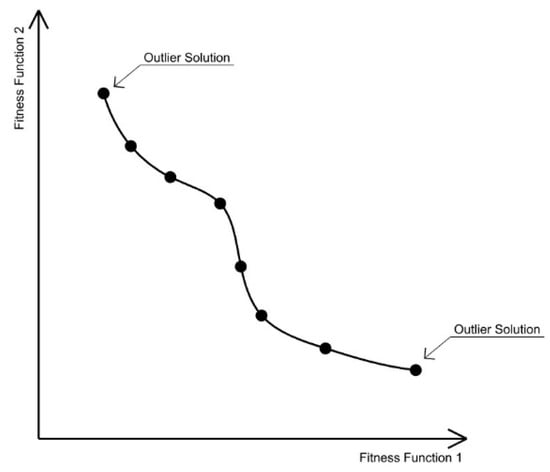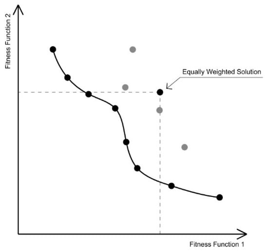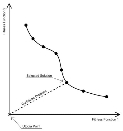 Yu [] and Zeleny [] proposed that when the ideal (or ‘Utopia’) solution is not accessible, the next best solution would be the closest one to the ideal solution. In this case, the ideal solution is considered the non-existent optimal solution in the objective space, and thus the selected solution is the one nearest to this point based on a Euclidean measure between the two. This ‘global compromise’ approach is usually considered by decision makers as the solution that best represents all fitness functions and is the closest to the optimal solution; however, this does not automatically translate to it being the ideal solution for the problem being investigated (Figure 4).