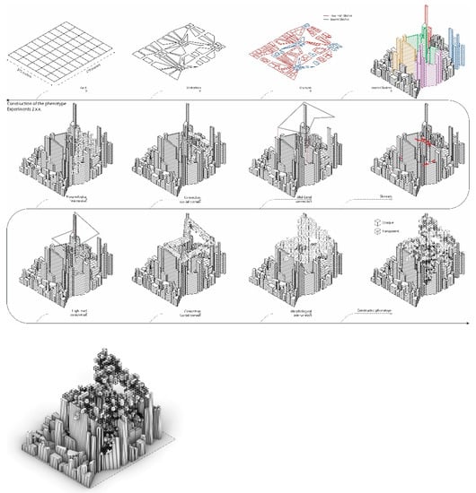 The mid-level elevated circulatory networks connect the towers in the urban tissue while developing a point of contact with the low-rise building blocks. The high-level elevated connections grow from the tallest towers within each cluster and circulate around the urban fabric and create a ring of horizontal habitable spaces. The transformations within the genome of the phenotype control the length, distance, and surface area of these elevated connections, to ensure adequate solar gain on the ground level, adequate solar gain on the elevated surfaces, and their accessibility across the urban fabric. Through interactions between the buildings (low-rise and towers) and the elevated connections, various interstitial spaces with unique spatial qualities emerge across the tissue. The benefit of the morphological interventions (through adding spatial units, voxels) of the elevated connections for the urban area is threefold: first, to elevate the flow of the city; second, to enable habitable spaces to emerge in the interstitial spaces between towers; and third, to develop a balance between horizontality and verticality, to attain a higher density. The chromosomes that define the phenotype’s construction are presented in Figure 8.