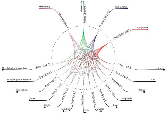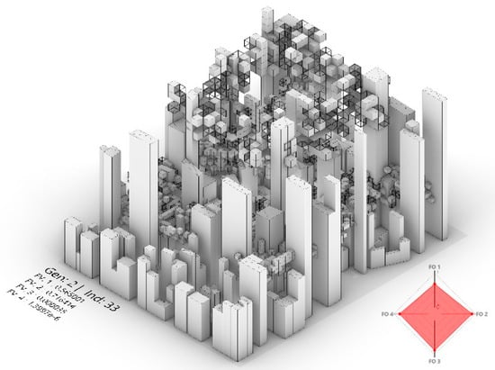 The application of multi-objective evolutionary algorithms (MOEAs) in design, specifically urban design, has gained momentum over the last decade. The adoption of MOEAs to solve complex design problems has enabled designers to address one of the primary challenges for the design of urban spaces: the ability to simultaneously address multiple design objectives that are in conflict with one another without necessitating trade-off decisions between the design goals. Although the method itself is firmly rooted in computer science and continues to grow as a field [,,,,,], its translation to design and its widespread application is associated with the emergence of various software that do not necessitate coding skills to implement and run the algorithm [,,,]. In doing so, access to MOEAs by designers (both for developers as well as users) has been more streamlined than any other point in history, allowing for innovative approaches to responding to, and designing for, design problems comprising multiple conflicting objectives. In urban design, the value of MOEAs is amplified, as it requires a performance-based metric approach to the design problem, allowing designers to integrate climatic, environmental, and urban metrics as key drivers for the algorithm [,,]. This data-driven approach to solving the complexity associated with the urban fabric informs all stages of the algorithmic process; however, key to this is the coupling of the user-driven analysis of the data and the way in which it informs the results outputted by the optimisation run.