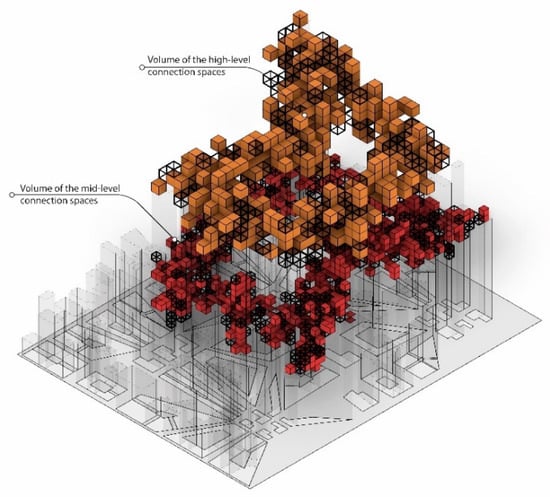 The morphology of urban areas and the efficiency by which they grow and occupy their environment has gained significant attention []. Current urban morphologies developed through lateral growth and centralised nodes of activities have two conflicting objectives: first, to be as compact as possible—centralisation; and second, to be as dispersed as possible—decentralisation []. In recent years, the dramatic increase in urbanites has placed tremendous demand on the spatial distribution and resource management of existing urban settings. Although its impact naturally leads to verticality, this has been implemented within the scale of a single building, yet the city’s flow continues to grow laterally at ground level. As a result, the programmes that are dependent on this circulatory system are being distributed at the street level, while buildings continue to develop as separate entities vertically. This led to Harvey Wiley Corbett, primarily known for his skyscraper designs, to be one of the first figures to suggest in the early 20th century the integration between multi-level street networks and mixed-use skyscrapers []. Patterns of settlements in many urban areas are transforming from dispersed fabrics to centralised entities with integrated infrastructures [], mostly in the form of segregated and standalone mixed-use buildings. However, there are cities where the application of higher-level connections has been proven to benefit the urban context. In Hong Kong, traffic congestion, accompanied by air and noise pollution, are the reasons for the incorporation of high-level connections within an urban block. While in Minneapolis and Calgary, their application was in response to the region’s severe climatic conditions, leading to an 18-km network of higher-level connections throughout the urban fabric. In addition to the climatic advantages, Corbett et al. [] argue that such spatial relationships allow for greater and more efficient circulation paths across the urban morphology.
