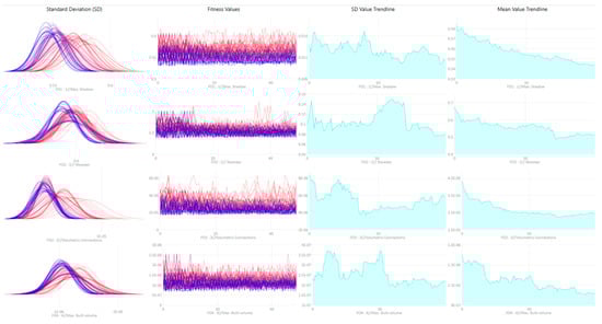 The results of the evolutionary algorithm. Each fitness function was analysed separately across four key metrics (from left to right): standard deviation, fitness values, standard deviation trendline, and mean value trendline.