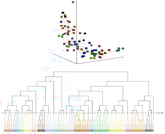The hierarchical clustering of the pareto front solutions with a K-value of 20, presented through the objective space and dendrogram. As the problem comprised of four fitness functions, it is difficult to read the cluster distribution in the objective space (which is 3-dimensional). In this case the dendrogram provides a clearer understanding of the relationship between solutions, both within and between clusters.