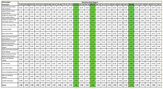 The primary challenge with complex urban problems is the number of fitness functions that can be optimised in the MOEA. The greater the number of fitness functions, the more complex the fitness landscape, and thus the ability for the algorithm to optimise the solution set towards a meaningful pareto front []. In most cases, this requires the DM to limit the number of fitness functions used in the algorithm despite there being a comparatively high number of fitness measures that are relevant to the problem. In this context, Stage 2 of the selection process engages with the relevant metrics that were not included in the algorithmic run, utilising them to further analyse the solution pool from Stage 1 and rank the solutions based on how they perform against these added metrics.