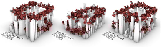 The third fitness function increases the volume of the elevated connections and the surface-to-volume ratio. This fitness function focuses on the formation of elevated connections throughout the urban tissue. It is defined to increase their volume as well as the ratio of their surface area to their volume. By increasing the volume of the elevated connections, the simulation generates solutions with volumetric connections that can be considered as extensions to the current urban morphology and be utilised as habitable spaces. It provides an alternative urban morphology for increasing density horizontally and vertically. The increase in the ratio of the surface area to volume contributes to self-shading mechanisms and produces shaded elevated outdoor surfaces (Figure 12).