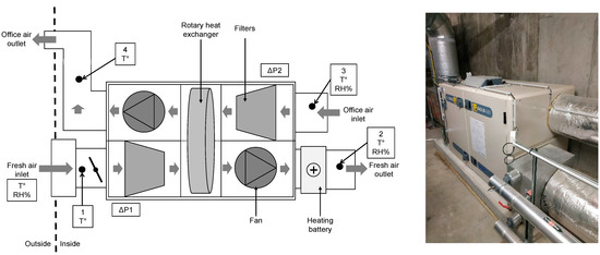 Figure 1 is a simplified diagram of the AHU, with the two compartments for air inlet and air outlet, and the different components. Each compartment contains two four-bag filters upstream of the rotary heat exchanger. A heating battery is located after the fresh air compartment on the supply air duct to regulate the temperature of the air supply to the office at 19 °C in winter. The dots numbered 1 to 4 in the figure represent the locations for measuring the temperature and relative humidity parameters in the ducts. Two data loggers provided continuous data acquisition from all temperature, relative humidity, and pressure sensors, at a frequency of 1/60 Hz.
