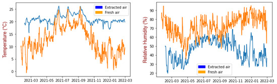 Figure 2 shows the changes in temperature and relative humidity measured during the study for fresh air and extracted air (measurement locations 1 and 3).
