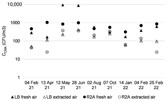For bacteria, the concentrations of airborne cultivable microorganisms were higher in the fresh air than in the extracted air (Figure 3). For fresh air, the concentrations ranged between 102 and 103 CFU/m3. An increase in bacteria in aerosols was observed for the months of May and June 2021 on LB medium, peaking at 104 CFU/m3. This was also observed by Frankel [21].