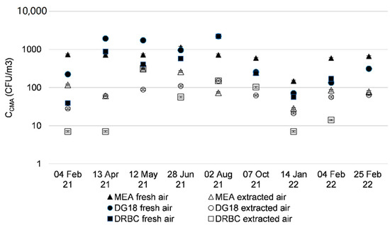 The concentrations of fungi were higher for all three media (MEA, DG18, and DRBC) in fresh air (Figure 4); concentration levels were around 103 CFU/m3 for fresh air. The concentrations of cultivable fungal aerosols in the extracted air ranged from 101 to 102 CFU/m3; these concentrations were stable throughout the sampling in different months. It appears that the MEA medium led to a higher microbial concentration with slightly higher concentrations.