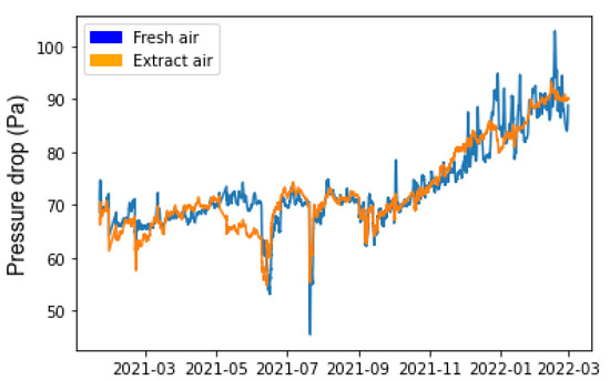 The curves representing the pressure drop for the two compartments have similar profiles (Figure 5). From the beginning of the study until September, the pressure drops for the two filters were stable, at between 65 and 70 Pa. In September, after about 6 months of operation, the pressure drop showed a linear increase, reaching about 90 Pa for fresh air and 80 Pa for extracted air. This pressure drop evolution followed a classic profile, with two stages of clogging [26]. The first stage was consistent with clogging due to depth filtration, where the glass fiber filter medium captures particles in its depth. In this period, the pressure drop did not change and remained stable. Following this, there was an increase in the pressure drop of the filters, related to clogging and the formation of a particulate cake on the surface of the filter medium. The pressure drops in June and July are related to maintenance operations and power cuts.