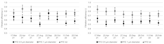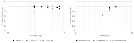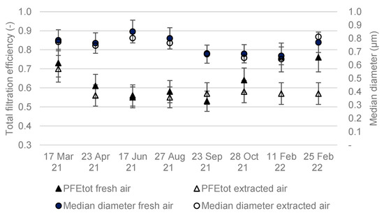 Filtration efficiency for particles with a diameter close to 1 µm ranged between 70% and 80%. The filtration efficiency of particles 1 µm in diameter was higher than for those 0.5 µm in diameter (Figure 7) in both the fresh air and extracted air compartments. In this range of particle diameters, the particles are collected mainly by the impaction mechanism, the efficiency of which increases with an increase in particle diameter or inertia [10,26]. The filtration efficiency with extracted air for particles 0.5 µm in diameter was close to the total particle filtration efficiency.
