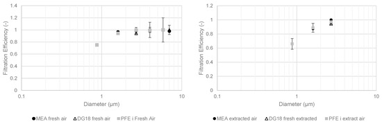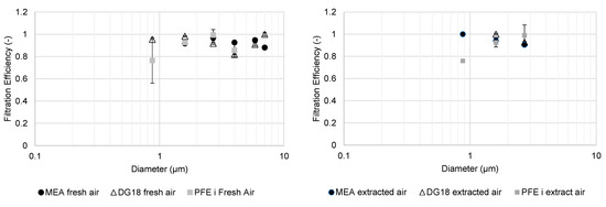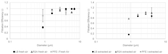 Fractional filtration efficiency for particles and cultivable microbial aerosols with bacterial media in February 2022 for fresh (left) and extracted (right) compartments.