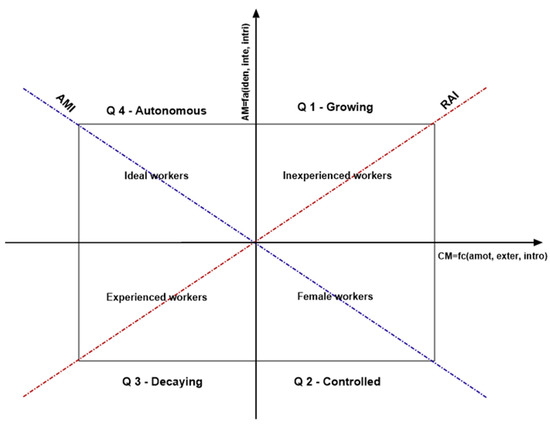 The first and main factor is the applicability of the simplex concept in Guttman’s Radex theory [48] on the ordered relations of correlated variables. Here, the magnitude of correlations among variables reflects their conceptual similarities. Variables are more similar when they are more highly correlated and vice versa. Specifically, a perfect simplex model evidences its largest correlations along a main diagonal, and these correlations increasingly taper off as one moves away from the diagonal. The results of matrices of correlation between motivational subscales for different work experiences are shown in Table A1, Table A2 and Table A3 (Appendix A). These matrices are not considered close to the simplex matrix. The coefficients of correlation between external regulation and intrinsic regulation, as well as those between introjected regulation and intrinsic regulation, were generally high. This means that external, introjected and intrinsic types of regulation were perceived similarly by the workers. More specifically, the correlations imply that the continuum of autonomy advocated in SDT may not hold.