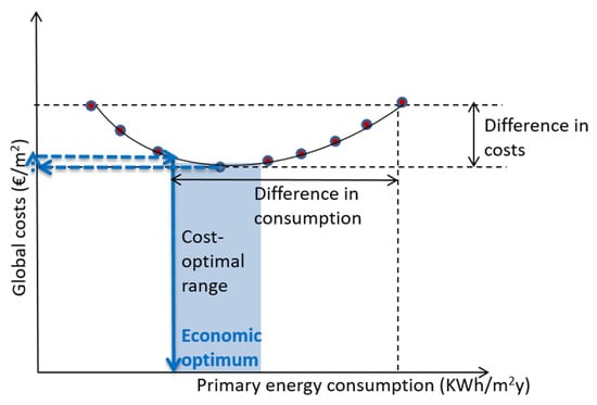 - Identification of cost-optimal levels. This should be expressed in primary energy consumption (in kWh/m2 per year) for each reference building. The cost-optimal configuration presents the lowest costs maintaining a high performance. It can be identified in the lower part of the curve that reports global costs (Eur/m2) and energy consumption (kWh/m2y) (Figure 1).
