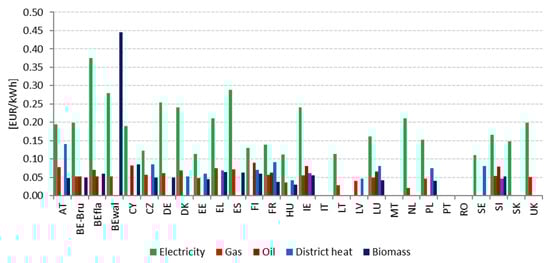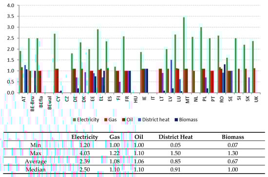 The analysis of the annual increase in energy prices (Figure 6, Table 3) showed that the average of the Member States’ values for electricity was closer than gas to the indication of the European Commission (For the estimation of fuels and electricity price development trends, the Commission reference data to Member States: https://ec.europa.eu/energy/en/data-analysis/market-analysis, https://ec.europa.eu/energy/en/news/reference-scenario-energy, accessed on 10 June 2022) (respectively 1.4% and 2.8%). However the deviation is quite high for all energy vectors, especially for electricity in the residential sector. For instance, here, Brussels applied only 0.2% against 5.4% for the Netherlands.