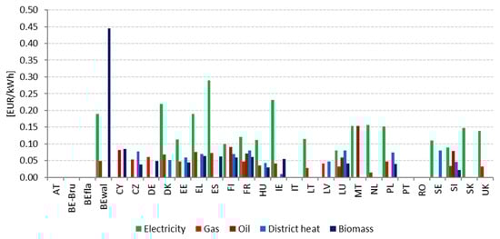The figures demonstrate that the divergences are not as relevant for energy prices. Only a few cases (e.g., Flanders, Belgium for electricity and Wallonia, Belgium for biomass) referred to values not close to the averages.