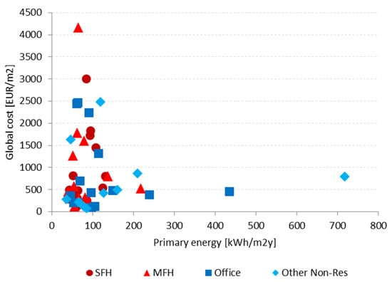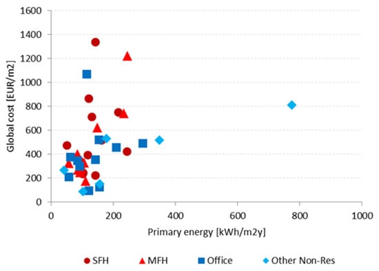 From the reports analyzed, it was not possible to extract all the cost-optimal levels for all Member States, as half of them did not derive them in a clear and complete way. Plotting the values collected in the primary energy/global cost domain (Figure 7 and Figure 8), an overall picture was obtained for new and existing buildings. The values pertain to single family houses (SFH), multi-family houses (MFH), and offices and other non-residential (N-R) buildings. The latter is the least-covered category, for which Member States are free to select the reference type. In some cases, these results refer to a particular type (often an educational building), in others to an average among different building types (e.g., school, commercial and hospital). For this reason, the comparison between countries cannot be fully consistent.