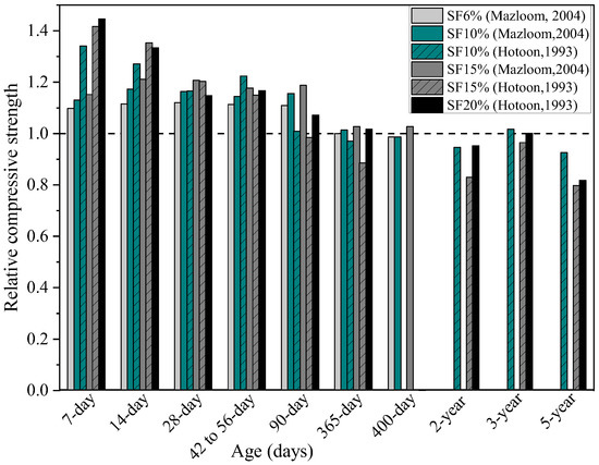 Figure 2 shows the ratio strength of SF concrete to the strength of control concrete without SF versus the curing ages at room temperature reported by Mazloom et al. [18] and Hooton [21]. As seen in Figure 2, replacing cement with SF increases the strength of concrete compared to OPC concrete. This enhancement in strength can be explained by transforming the weak crystals of Ca(OH)2 into calcium silicate hydrate (CSH) through the pozzolanic reaction. The calcium silicate hydrate as a hydration product improves the strength of concrete [51]. The substitution of cement with SF mainly influences the short-term strength of concrete. Silica fume concrete has low long-term strength gain compared to concrete without silica fume after one year.