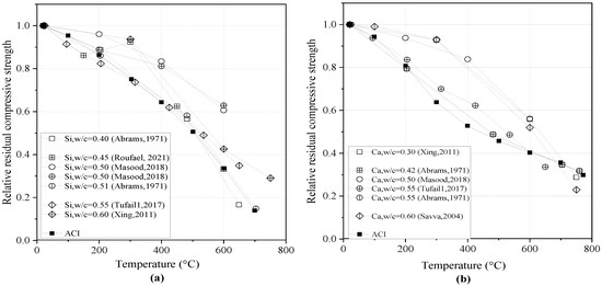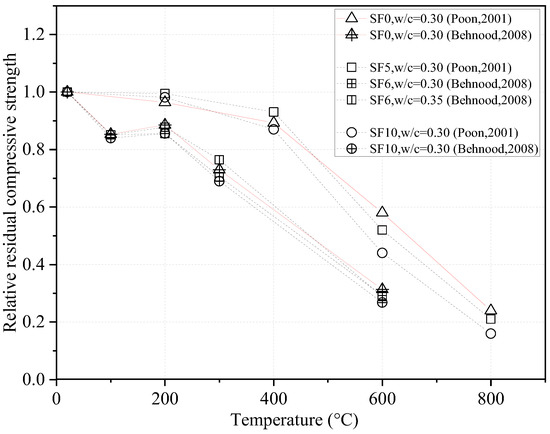 The relative residual compressive strength of concrete containing silica fume (SF) at different water-to-cementitious materials ratios (w/c) [15,35].