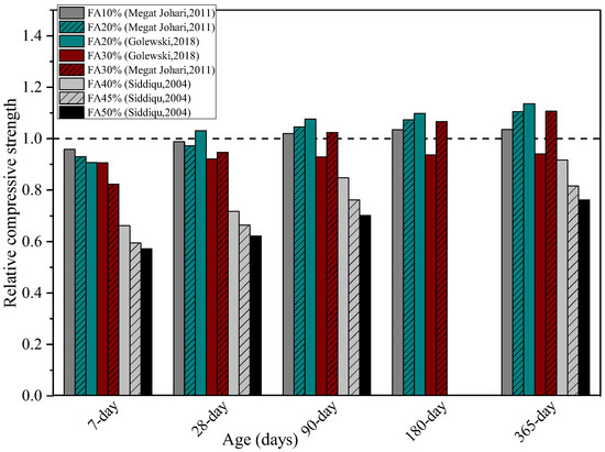 Due to the pozzolanic reaction and micro filler effect, FA could improve the properties of cement and concrete [57]. The content of Al2O3 and SiO2 are major factors that influence the pozzolanic reaction as they react with calcium hydroxide and produce more CSH gel. The variation in the relative strength of FA concrete versus concrete curing age is shown in Figure 5. It can be seen that FA concrete, particularly concrete with higher FA content, showed lower relative strength at early ages because of the slow rate of the pozzolanic reaction of fly ash and Ca(OH)2 compared to OPC concrete. However, the strength of FA concrete increased at later ages because of the additional formation of CSH due to the use of unreacted fly ash [30]. As the percentage of FA increased, the strength of concrete reduced because of the slower rate of hydration with respect to cement [63]. Fly ash concrete with up to 30% FA substitution showed a higher long-term strength compared to OPC concrete.