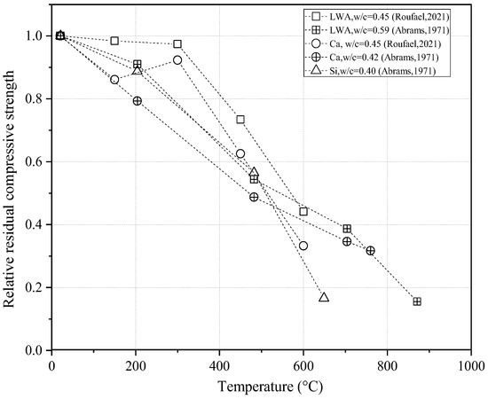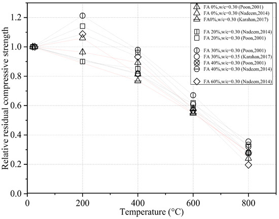 The relative residual compressive strength of concrete containing fly ash (FA) at different water–cementitious materials ratios (w/c) [35,39,42].