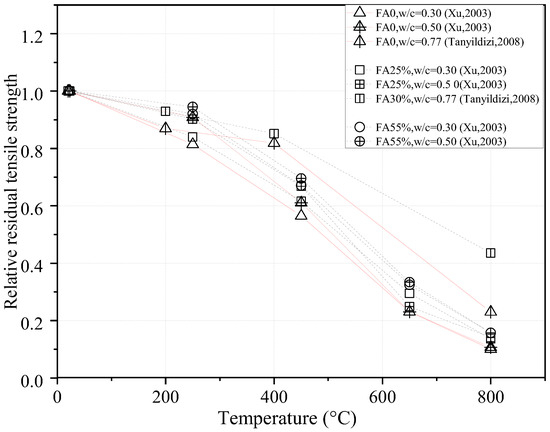 The relative residual tensile strength of concrete containing fly ash (FA) at different water-to-cementitious materials ratios (w/c) [41,43].