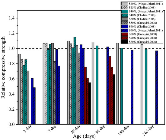 Relative compressive strength of concrete containing slag (S) at various curing ages [26,28,29].