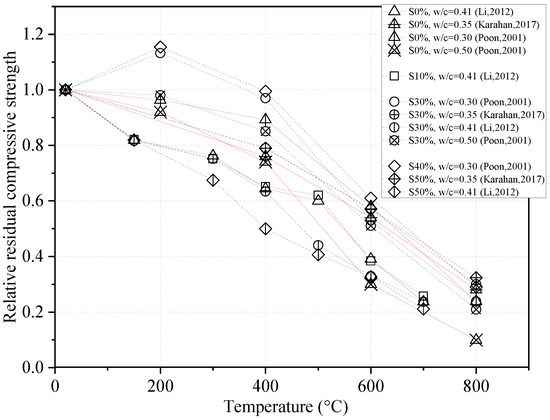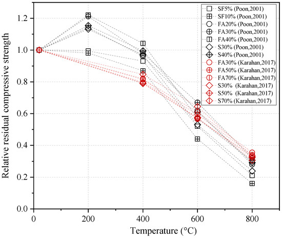 Siddique et al. [32] studied concrete with 0%, 20%, 40%, and 60% GGBFS when subjected to temperatures up to 350 °C. At 100 °C, the strength of concrete containing 0% and 20% GGBFS was reduced. Then, the strength increased with increasing temperature. However, no significant change occurred in the residual strength for the GGBFS concrete at replacement ratios of 40% and 50% with the increase in this temperature. It was also found that the strength decreased as the GGBFS replacement ratio increased at 350 °C.