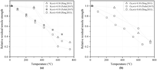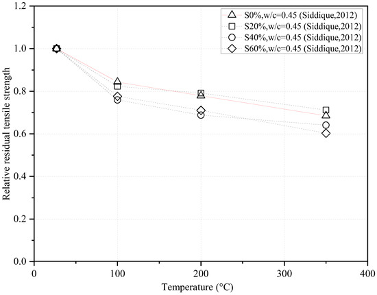 The relative residual tensile strength of concrete containing silica fume (SF) at different water-to-cementitious materials ratios (w/c) [16,36].