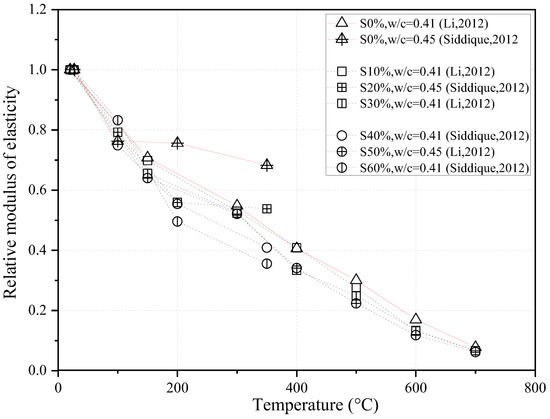 Nasser et al. [44] examined the modulus of elasticity of concrete made with 25% FA exposed to 232 °C. It was observed that the modulus of elasticity remained constant in the temperature range of 121 °C to 149 °C. However, the modulus of elasticity decreased when the exposure temperature was 232 °C.