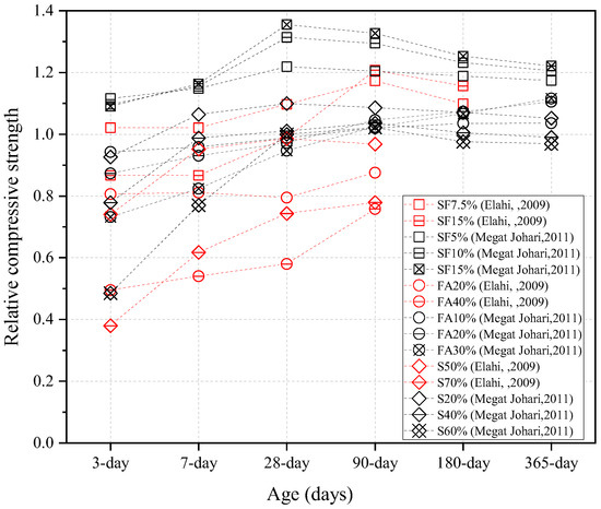 Relative compressive strength of concrete containing fly ash (FA) at various curing ages [23,24,26].