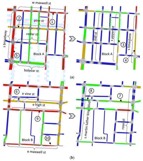 All case tweets in the downtown blocks (Figure 6) are available in Table S2, and two specific examples show the process from raw tweets to extracted information (Figure 7). There are no lexicons recording these entities (e.g., “w maxwell street”, “blocked”, and “center and right” in Figure 7), while the developed SMDbS possesses the capacity to extract the desired information intelligently. It is recognized that many events are unreported by social media data, so Figure 6 just aims to show the devised SMDbS’s capacity of extracting finer-grained location instead of concluding the spatial distribution of traffic incidents in Lexington City.