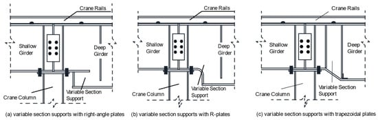 Variable-section supports can be divided into three categories according to the geometry of the support: variable-section supports with right-angle plates, variable-section supports with R-plates and variable-section supports with trapezoidal plates [1], as shown in Figure 2. A number of fatigue tests were performed on variable-section supports by the authors of this article, through which the fatigue crack initiation sites of variable-section supports with right-angle plates and R-plates were determined [2,3,4]. The fatigue lives of variable-section supports with trapezoidal plates for metallurgical plant operations were evaluated, and the fatigue life control point of this kind of variable-section support was defined by Caglayan [5]. To enhance the fatigue strength of the variable-section support, a variety of variable-section supports were designed by modifying the geometry of the variable-section support, such as variable-section supports with R-plates and three-web plates [6] and variable-section supports with right-angle curved end plates [2]. These geometric modifications change the structural detail classification and make the existing S-N curves not applicable. However, the traditional fatigue strength design methods recommended in current design codes [7,8,9], such as the nominal stress method and the hot-spot stress method, are based on existing S-N curves of corresponding structural detail classification and are not capable of effectively predicting the fatigue crack initiation site. Obviously, traditional fatigue prediction experience is not applicable. Therefore, scientifically evaluating the fatigue strength of variable-section supports and avoiding expensive fatigue tests for each kind of variable-section support is a major problem.