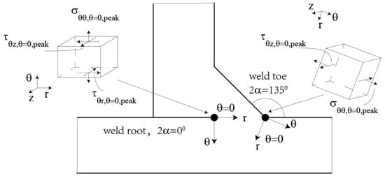 where , , and are the notch stress intensity factors tied to Modes I, II, and III for i = 1, 2, and 3, respectively; , , and are the peak stresses in local polar coordinates, as shown in Figure 3; and is the ‘global element size’ parameter.